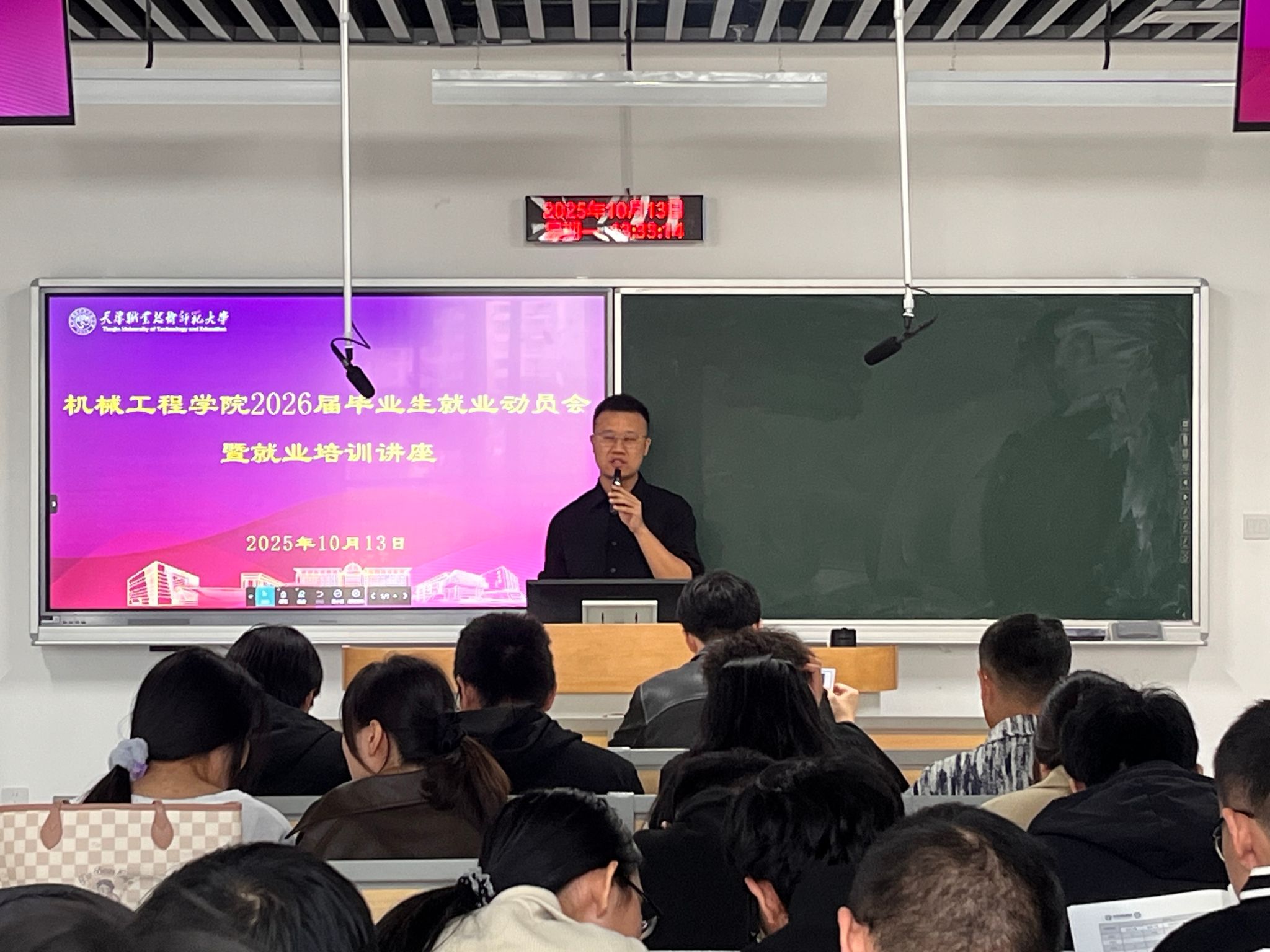 为进一步研判就业形势、明确目标,全力推动2026届毕业生更充分、更高质量就业,10月13日,机械工程学院在技能实训楼311室举办2026届毕业生就业培训讲座,特邀半月讲坛教育资深讲师管宏龙作就业专题辅导。学院党委副书记刘娜、毕业班辅导员及120余名学生参会。