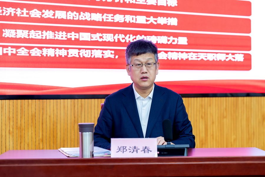 郑清春紧紧围绕深入学习领会习近平总书记在党的二十届四中全会上的重要讲话和《中共中央关于制定国民经济和社会发展第十五个五年规划的建议》精神,从深刻理解党的二十届四中全会的重要意义,准确把握“十五五”时期在基本实现社会主义现代化进程中的重要地位,深刻领会“十五五”时期经济社会发展的指导方针和主要目标,全面理解“十五五”时期经济社会发展的战略任务和重大举措,坚持和加强党的全面领导、凝聚起推进中国式现代化的磅礴力量,全力以赴抓好党的二十届四中全会精神贯彻落实,推动全会精神在天职师大落地生根、取得实效等方面,对党的二十届四中全会精神作了深入宣讲和具体阐释。