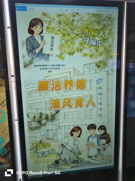 为进一步推进校园廉洁文化建设,切实将廉洁修身理念融入立德树人全过程,2025年12月31日至2026年1月23日期间,机械工程学院在逸夫楼一楼大厅组织开展“清风润匠心 AI助廉洁”2025年“廉洁文化月”主题活动作品展播,以创新载体推动廉洁教育走深走实。